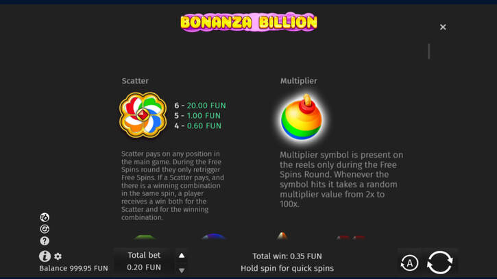 Bonanza Billion é um slot de 5 rolos e 10 linhas de pagamento. Os símbolos incluem picaretas, lanternas, carrinhos de mineração e pedras preciosas coloridas. Para jogar, os jogadores devem selecionar sua aposta e girar os rolos. O objetivo é obter combinações vencedoras de símbolos nas linhas de pagamento ativas.